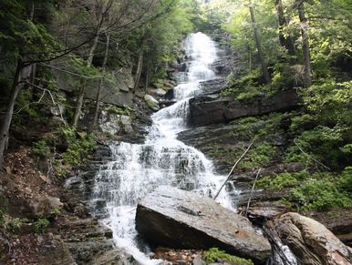 Summary: Near the top of the list for Vermont’s largest waterfall, Moss Glenn Waterfall in Stowe is a magnificent, multi-tiered fall set amidst beautiful mountains. It’s nearly 125 feet tall, and like most of Vermont’s falls, it’s easy to get to.